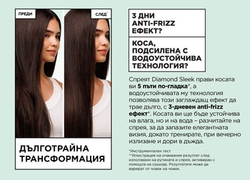 Иновативната формула на спрея Diamond Sleek се активира чрез топлина – след напръскване е необходимо да изсушите косата си със сешоар, за да активирате блясъка. За оптимални резултати предлагаме да завършите процедурата с преса за коса. И не се притеснявайте: спреят осигурява топлинна защита до 230°C*.