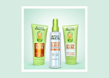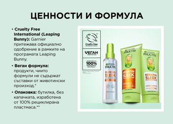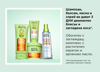 Можете да комбинирате спрея с любимата си рутина на Fructis, но за най-блестящ ефект, опитайте НОВАТА гама FRUCTIS KERATIN SLEEK.