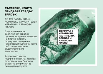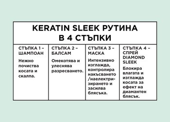 Keratin Sleek, рутина за диамантен блясък и гладка коса, осигурява дълготрайна трансформация и анти-фриз (anti-frizz) ефект за непокорната, суха коса.